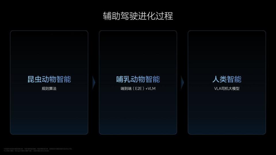 VLA的实现不是一个突变的过程,是进化的过程,经历了三个阶段,对应理想汽车辅助驾驶的昨天、今天和明天。第一阶段,理想汽车自2021年起自研依赖规则算法和高精地图的辅助驾驶,类似“昆虫动物智能”。第二阶段,理想汽车自2023年起研究,并于2024年正式推送的端到端+VLM(Vision Language Model,视觉语言模型)辅助驾驶,接近“哺乳动物智能”。