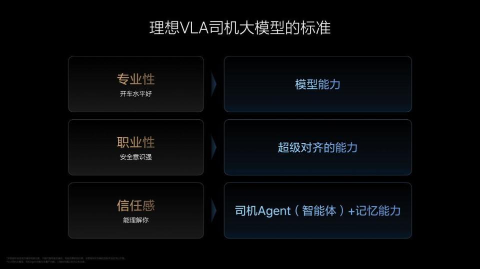 判断司机Agent是否是个好司机,有三个关键标准:专业能力、职业能力和构建信任的能力。VLA司机大模型提升了专业能力,超级对齐增强了职业能力,VLA通过理解自然语言、具备记忆能力提升了构建信任的能力。