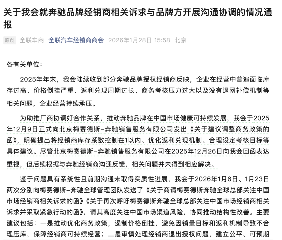 日前,全国工商联汽车经销商商会(简称“全联车商”)发布《关于我会就奔驰品牌经销商相关诉求与品牌方开展沟通协调的情况通报》,披露了2025年底以来围绕梅赛德斯-奔驰中国经销商经营困难所进行的多轮交涉情况。