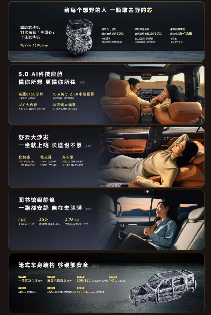 舒适体验更是双车的一大亮点。旅行者骏马版内饰采用硬派豪华软包与 G318 光刻饰板,64 英寸全景大天窗带来通透视野,五星健康座舱 + 理想级大沙发,全车 7 处充电位满足出行需求,魔术空间更能打造移动景观卧房;自由者骏马版堪称 “15 万级舒适天花板”,拥有行业唯一双认证健康座舱(5A 健康座舱 + 德国莱茵 TUV 生态内饰认证),10 层舒云座椅堪比汽车界芝华仕,图书馆级静谧空间(怠速噪音 < 38 分贝)、15 万级唯一女王座驾(一键躺平 + 通风加热 + 腿托),更能拓展 1.5*2 米移动豪华大床房,搭配 64 英寸全景天窗,露营看星空氛围感拉满。