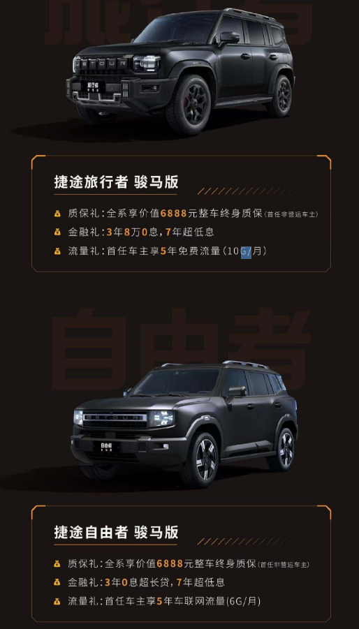 更值得一提的是,双车均推出 3 重重磅购车权益,首任非营运车主可享价值 6888 元整车终身质保,彻底打消用车顾虑;金融礼方面,旅行者骏马版享 3 年 8 万 0 息、7 年超低息,自由者骏马版享 3 年 0 息超长贷、7 年超低息,轻松减轻购车压力;流量礼上,旅行者骏马版首任车主享 5 年 10G / 月免费流量,自由者骏马版享 5 年 6G / 月车联网流量,车机娱乐、智能导航全程无忧。