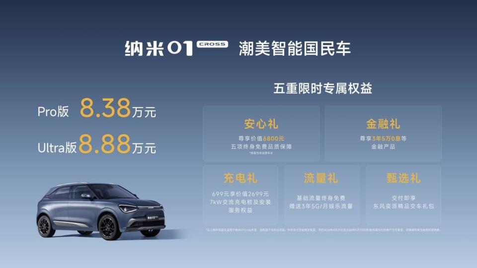 浏览:213374月25日,“奕起热爱 创领未来”奕派科技2026北京国际车展新品发布会上,“潮美智能国民车”东风奕派纳米01 Cross正式上市。新车推出Pro版和Ultra版两种配置,官方指导价分别为8.38万元和8.88万元,同时带来总价值超过1.5万元的五重限时专属权益,包括整车和三电终身质保在内的安心礼、3年5万0息的金融礼,以及充电礼、流量礼、甄选礼,精准满足年轻群体多元化出行需求。