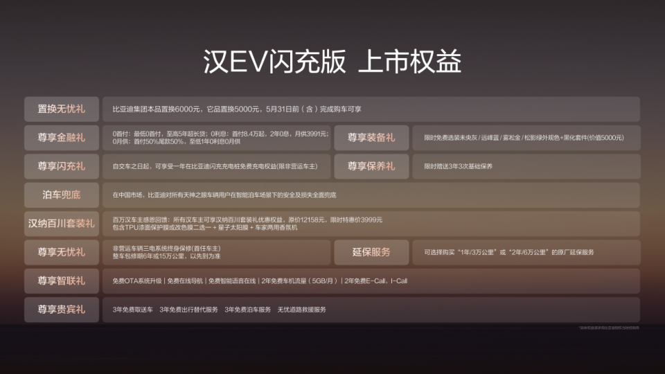 同时,比亚迪还为用户准备了置换无忧礼、1年免费闪充权益、0首付/0利息/0月供任选其一的金融礼、3年3次基础保养、包含3年免费取送车的尊享贵宾礼等共11项权益。针对追求个性的用户,官方推出价值超1.2万元的“汉纳百川”进阶生活套装,限时特惠价仅需3999元。