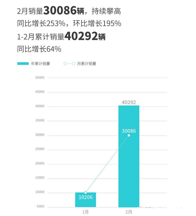 广汽埃安2023年2月销量30086辆,同比增长253%,环比增长195%;1-2月累计销量40292辆。