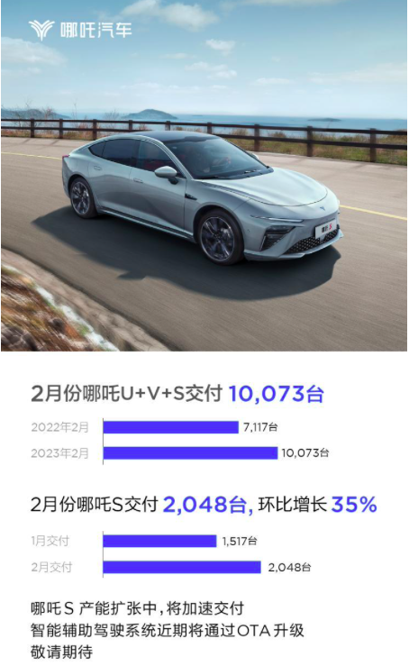 哪吒汽车2月交付10073辆,同比增长达到41.5%。具体来看,哪吒V2月实现交付5013台,哪吒U2月实现交付3012台,哪吒S2月实现交付2048台,环比增长35%。