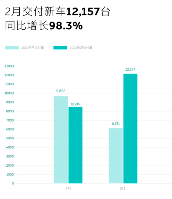 蔚来汽车2月交付量公布,2月共交付12157辆,环比增长42.9%,同比增长98.3%。