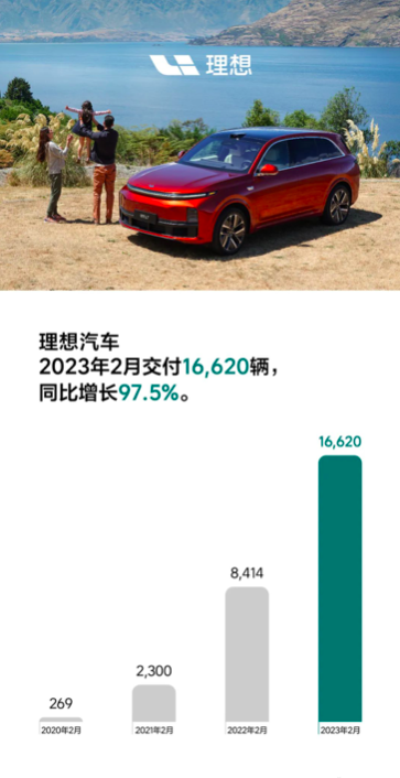 近日,理想汽车公布2023年2月交付数据。2023年2月,理想汽车共计交付新车16,620辆,同比增长97.5%。自交付以来,理想汽车累计交付量已达到289095辆。