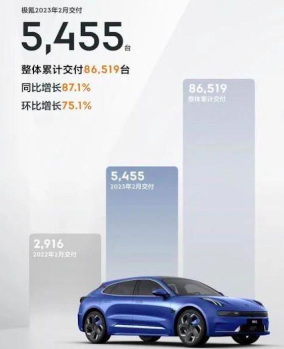 数据显示,极氪汽车2月交付5455台,同比增长87.1%、环比增长75.1%。