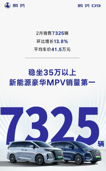 2023年2月,腾势汽车共销售了7325辆新车,环比增长13.8%,平均车价为41.5万元。