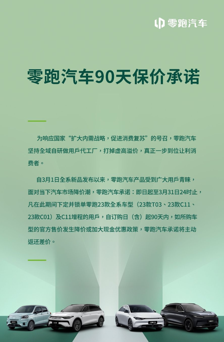 面对当下汽车市场降价潮,零跑汽车承诺:即日起至3月31日24时止凡在此期间下定并锁单零跑23款全系车型 (23款T03、23款C11、23款C01) 及C11增程的用后,自订购日 (含) 起90天内,如所购车型的官方售价发生降价或加大现金优惠政策,零跑汽车承诺将主动返还差价。