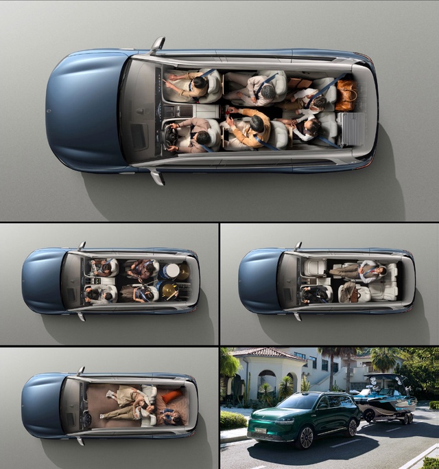 问界M9官宣给出了几种用车场景,这类俯视图容易压缩视觉空间感,不过结合行李厢容积数据和车头占比来看,尽管拥有超过3米的轴距,但如果前中后三排座都想拥有相对舒适的乘坐体验,三排座都得将就点,尤其是面对三排乘客都是180公分左右身高的成年人时,笔者好像看到过有车友抱怨体验后排座椅时碰到了投影系统,不过好在这项装备为选装配置,选装价格20000元。