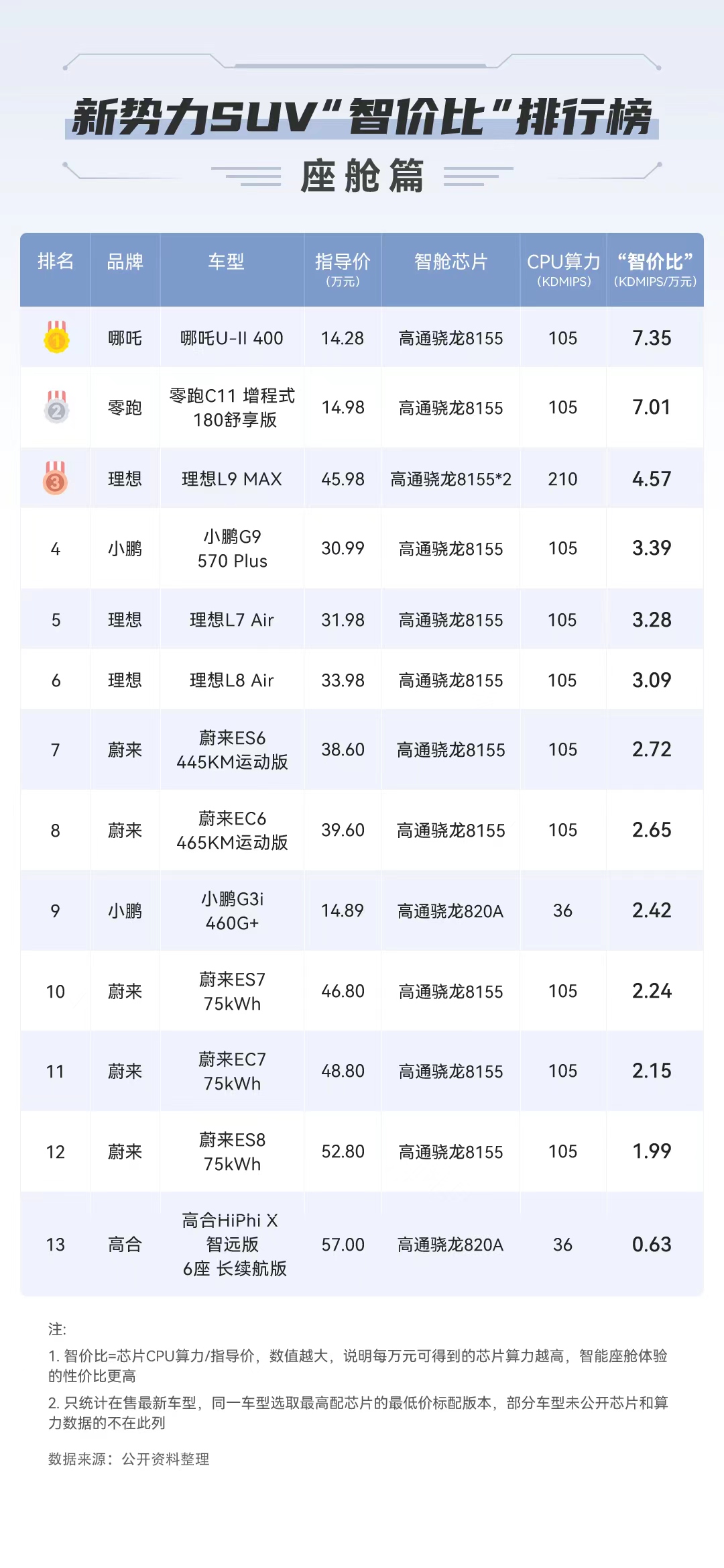 浏览:14639近年来,汽车行业加速变革,已然进入电动化、网联化和智能化的融合时代。在这种背景下,车辆的“智价比”逐渐成为消费者选购汽车的核心关注点。如何在保障价格“不离谱”的同时,去满足用户“既要又要还要”的心理,成为了产品的制胜关键。特别是主打智能的新势力,更有看点。在新势力SUV中,“智价比”的王者非“15万级智能天花板”哪吒U-II莫属。从新势力SUV智价比排行榜看,哪吒U-II 400排名第一,甩开“蔚小理”,再次验证其细分销冠的实力。