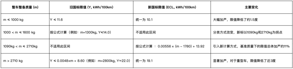 简单来说,新国标的要求更严:相同重量的车,现在必须做得更省电才能达标;分类更合理:调整了质量分区,使标准更贴合当前市场上车辆的实际情况。最终目的是推动车企提升技术,让消费者买到能效更高、更省钱的产品。