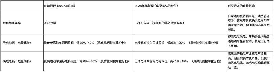 举例来说,2025年有不少纯电续航里程在100公里以内的插混车型(包括增程在内),在2026年将无法享受政策减免。关于后两条,亏电油耗,假设旧规下,一台燃油车的油耗限值是8L/100km,插混车只需低于8L*65%=5.2L即可。在新规下,新版燃油车限值可能先是加严20%,变为6.4L/100km。然后插混车需要低于6.4L*70%=4.48L/100km;
