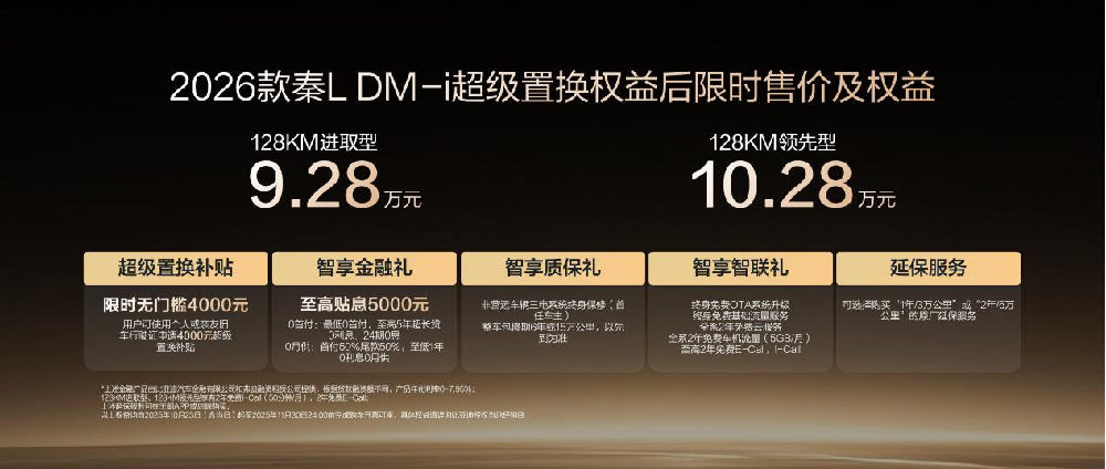 浏览:69845【行业资讯】10月23日,2026款秦L DM-i正式上市,共2款车型,包括128KM进取型和128KM领先型,官方指导价9.68-10.68万元。2025年11月30日24:00前完成购车开票可享限时无门槛超级置换补贴4000元,补贴后售价9.28-10.28万元。