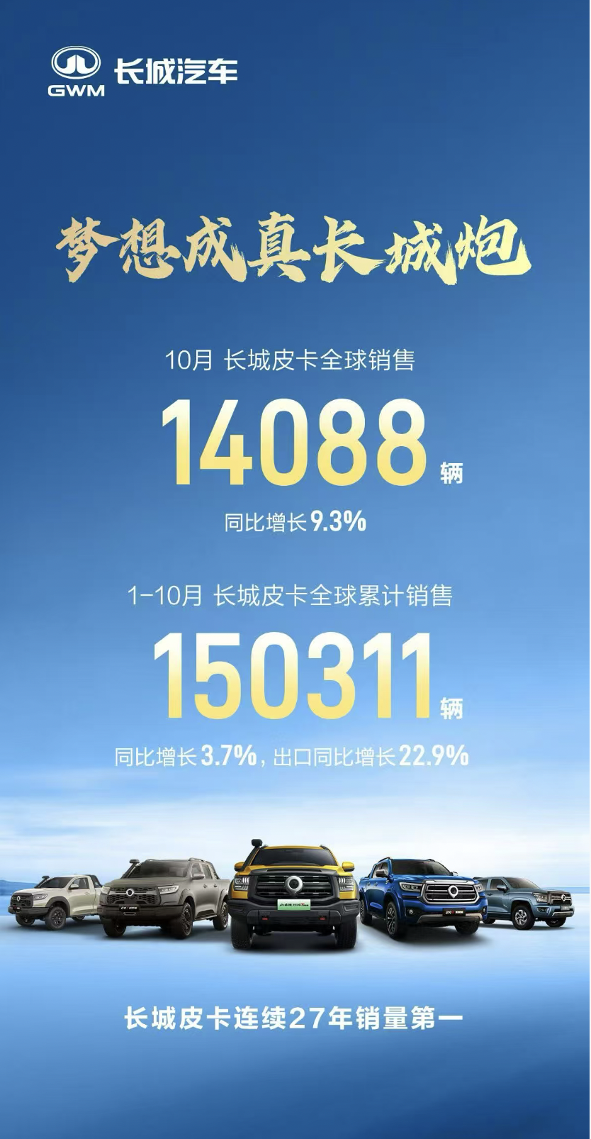 今年1月至10月的表现,长城汽车累计销量已突破百万,达到1,066,436辆,同比增长9.87%,整体发展势头稳健。