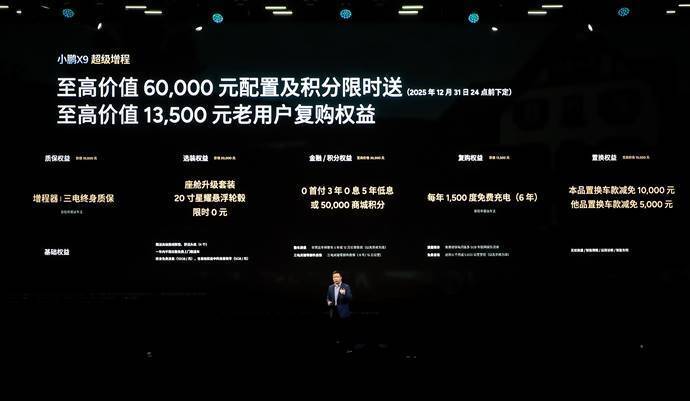 浏览:434402025年11月20日,全球续航最长大七座——小鹏X9超级增程正式上市!新车共推出Max版和Ultra版两个版本,官方指导售价分别为30.98万元和32.98万元。小鹏汽车同步推出多重上市权益及丰富购车礼遇:即日起至2025年12月31日24点前下定,可享受至高价值60000元配置及积分权益:增程器和三电系统终身质保权益价值10000元;座舱升级套装+20寸星耀悬浮轮毂选装权益价值20000元限时免费;0首付3年0利息/5年低利息金融权益或50000商城积分权益至高价值30000元。更有老用户还可享受至高价值23500元的复购权益:每年1500度免费充电6年有效期的复购权益价值13500元;本品置换车款减免10000元和他品置换车款减免5000元。