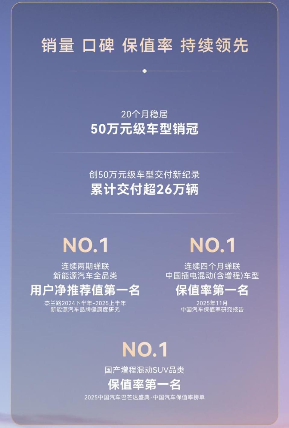 问界M9的成功,不止于销量。在中国汽车流通协会发布的《2025年11月中国汽车保值率研究报告》中,问界M9已连续四个月蝉联中国插电混动(含增程)车型保值率第一,并在2025中国汽车巴芒达盛典“中国汽车保值率榜单”中位列国产增程混动SUV第一,展现50万级豪华车价值新高度。
