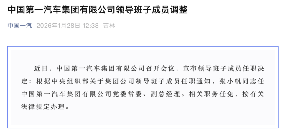 浏览:46457近日,中国第一汽车集团有限公司宣布一项重要人事调整:张小帆出任公司党委常委、副总经理。此项任命系根据中央组织部关于央企领导班子成员的任免通知作出,相关程序将依规履行。
