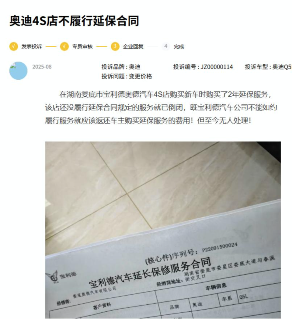 时间回溯到2022年9月中旬,王先生在湖南娄底市宝利德奥德汽车4S店看中了一辆奥迪Q5L,顺利完成购车手续后,在销售人员的推荐下,又花费一万多元购买了一份为期2年的延保服务。按照约定,这份延保服务本该从2023年9月正式生效,为车辆后续使用增添一份保障。可让王先生始料未及的是,还没等到延保生效,这家既负责车辆销售、又承诺提供延保服务的4S店,就在2023年2月毫无征兆地倒闭了,这突如其来的变故让他一下子陷入了维权无门的困境。