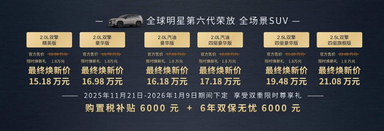 全新荣放在外观、智能座舱、动力、智驾辅助、安全配置等方面全面升级,全系商品力提升达到1.5万元水平,增配价更低,诚意满满。不仅如此,为回馈广大用户的支持,11月21日起到2026年1月9日期间,确定为“限时尊享下定期”。期间预订用户,将享有高达1.8万元的现金直给,以及购置税补贴6000元,价值6000元售后服务权益的双重限时大礼包。