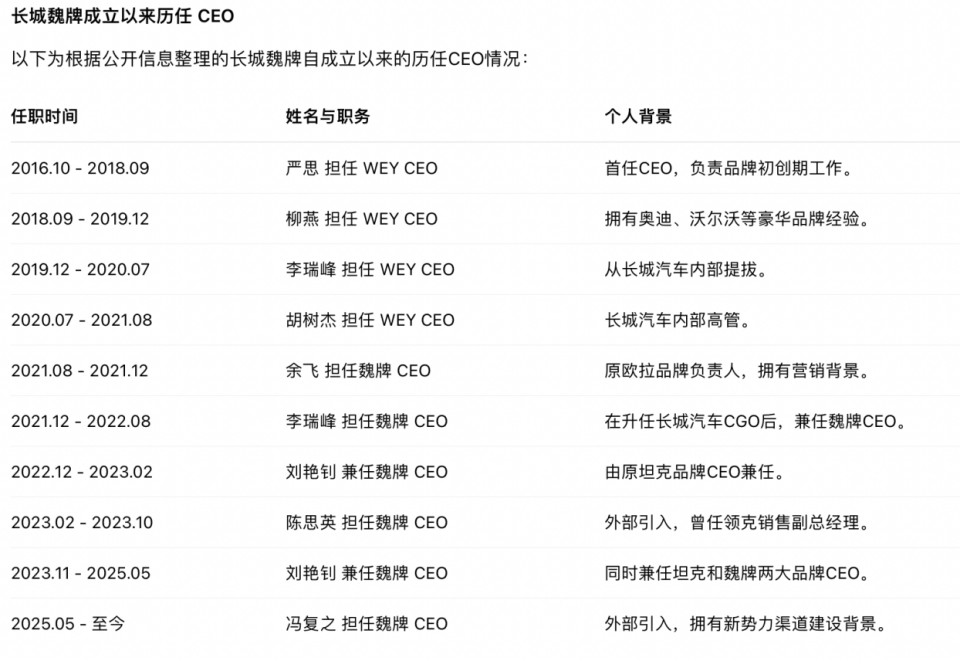 浏览:36784日前,有消息传出,长城高端品牌魏牌CEO冯复之正在“休假”。据了解,其审批业务的权限已经被集团公司收回。冯复之的离职似乎已成既定事实,接任者已内定为哈弗总经理赵永坡。表面看,这是一次寻常的高管更迭;深层看,魏牌作为魏建军以个人姓氏背书的高端品牌,其战略方向与高管任免高度依赖创始人意志。九年时间更换了10任CEO,反映的从来不是人才匮乏,而是品牌定位持续摇摆与权力高度集中之间的结构性矛盾。