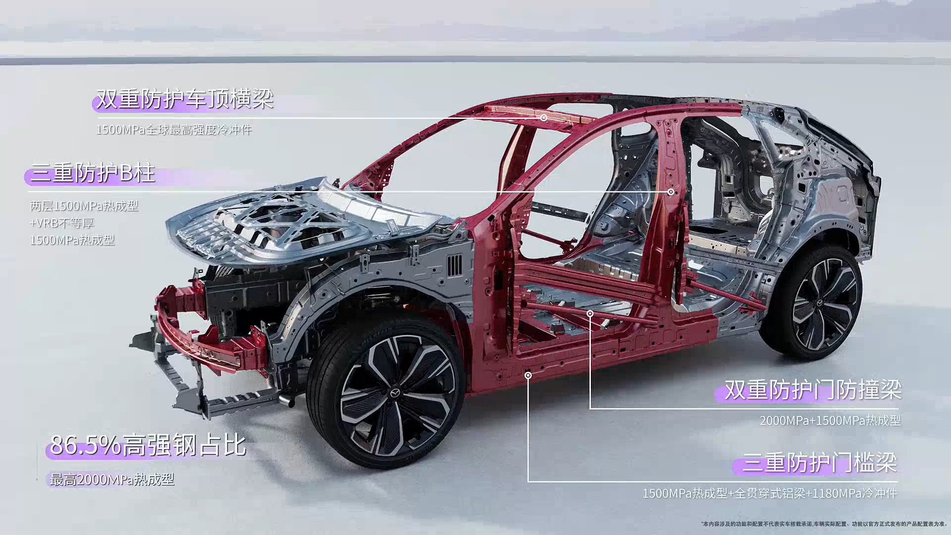 马自达EZ-60官方宣传视频提到了安全车身几项要点,从车身结构到前防撞梁,再到A柱B柱和门槛梁,防护架构设计和零部件布局挺好。